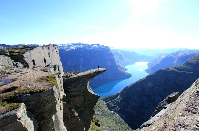 아무리 여행이나 이런 현실에 있을 것 같지 않은 곳에 관심이 없는 사람이라 할지라도 한 번쯤은 봤음직할 사진이다. 이곳은 꼭 이름을 알아두어야하는데, 트롤퉁가의 뜻은 트롤의 혀라는 의미이다. 진짜 괴물의 혀라고 생각드는 곳이다. 피요드르가 만들어낸 아름다운 여행지 트롤퉁가는 해발 1100m 높이의 바위절벽입니다.
